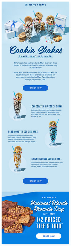Tiff's Treats is a warm cookie retail company that started in Austin, but has since expanded nationwide. Tiff's specializes in warm cookies, and what we call "warm moments". As Email Marketing Designer, I was in charge of creating and coding campaign assets that bolstered brand love through seasonality and engaging visuals, while still maintaining brand consistency through typography, photography, and illustration styles.